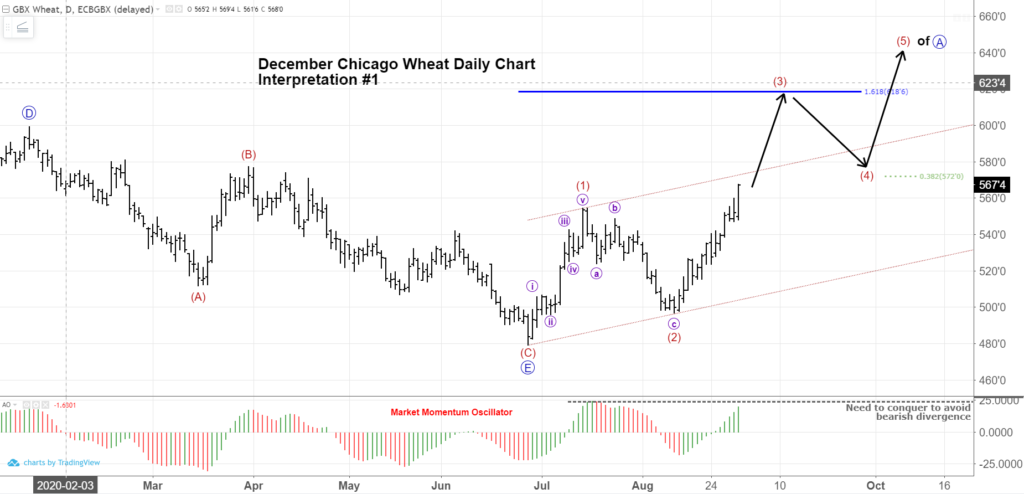 Extrapolating that forecast for the present, we expect prices to continue to zig-zag higher where December futures target $6.18/bu in wave (3) of A, pullback to the $5.80-area in wave (4), and make a final push higher in wave (5) of A to a target of $6.40. This is displayed on the daily chart below.