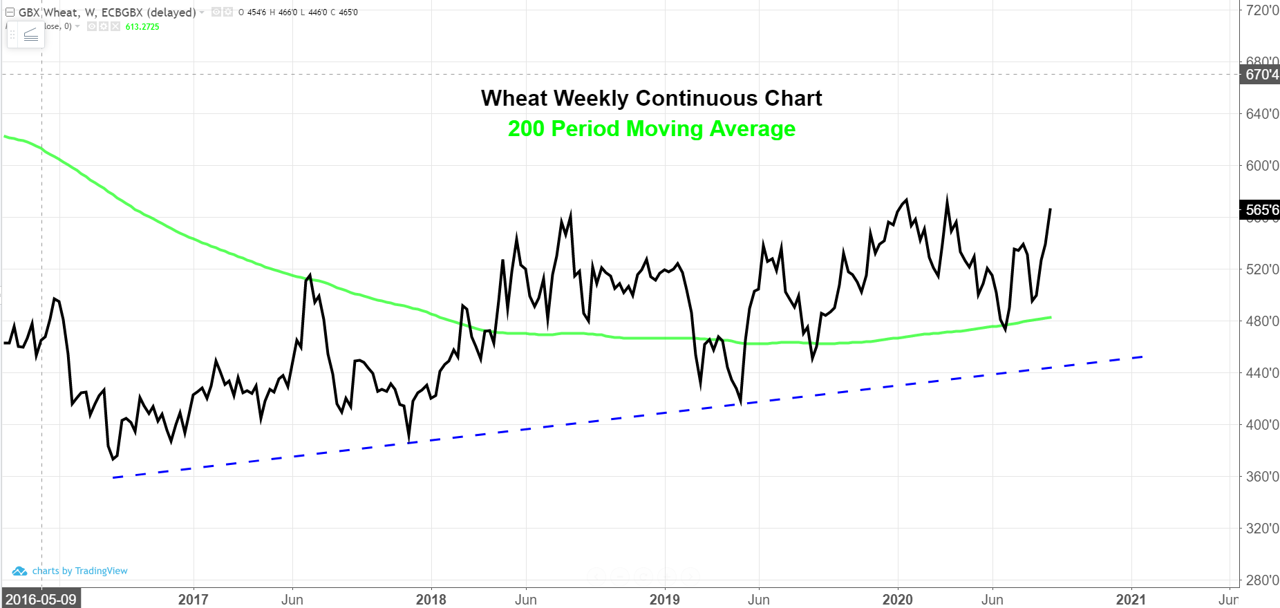 Long-term trend continues to be up. If prices move out and above the corrective price channel with speed (see chart 1), we will become more emboldened with our primary forecast developed in previous posts that calls for Chicago Wheat prices to target $6.80-$7.00. If prices fail to take out the marked goalposts, chances are we will retreat back near $5.00. This will be a fortunate event for buyer’s who have not locked in long-term coverage and an excellent second change to extend coverage. Long-term trend remains higher regardless of price action in the coming days. The long-term trend is only in doubt if prices go below the 200 day moving average and is negated if prices take out the blue, dotted trend line seen on the weekly charts.